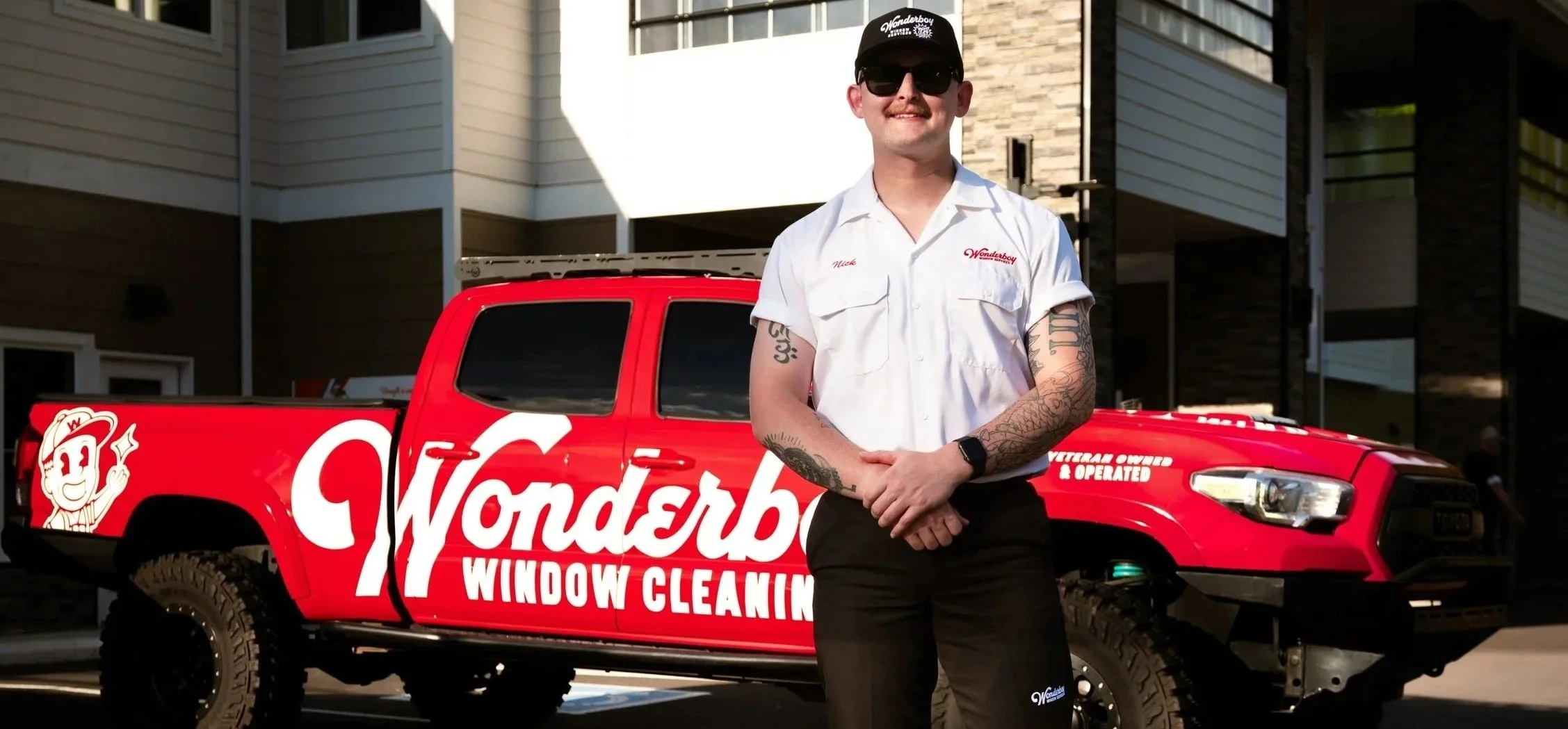 A person cleaning a window with soap and a squeegee on a sunny day.